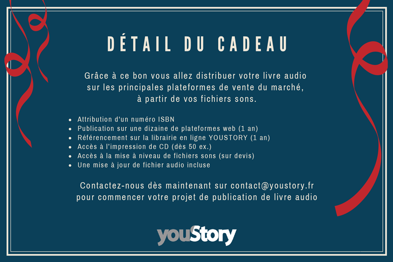 Offrez à l’un de vos proches la publication de son livre audio à petit prix grâce à notre pack AUDIO. Ce pack de publication s’adresse aux auteurs qui souhaitent distribuer leur livre audio partout en France et dans le monde. Il permet d’obtenir un numéro ISBN et de publier un livre audio sur les principales plateformes de ventes en ligne, sans avoir de compte à rendre en matière de contenus (sons, voix, montage, etc.)*